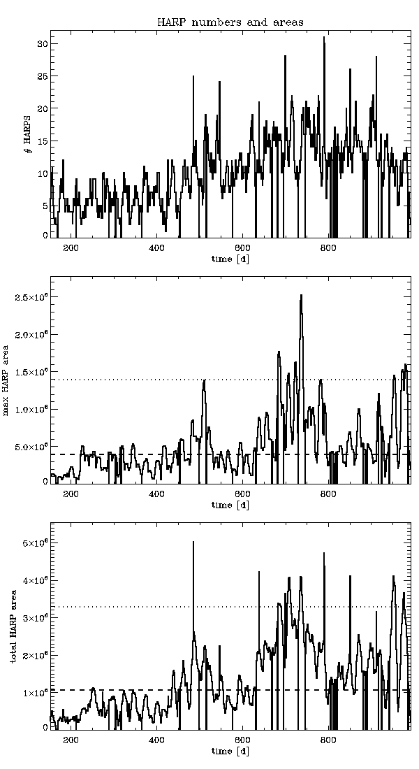 Start with the definitive HARPs, from 2010.05.01_00:00:00_TAI to 2012.08.19_00:00:00_TAI (noting that the last few weeks may be incomplete because of the use of the full disk crossing for determining a HARP size) in the series hmi.Mharp_720s. The dashed horizontal line marks the median value; the dotted horizontal line marks the 95th percentile. Time is in days since 2010.01.01_00:00:00_TAI, and only the HARPs present at 00:00:00_TAI are included. (I did not properly account for leap year, so days since 2012.02.29 are offset by one, and the number/area on 2012.03.01 are incorrect.)