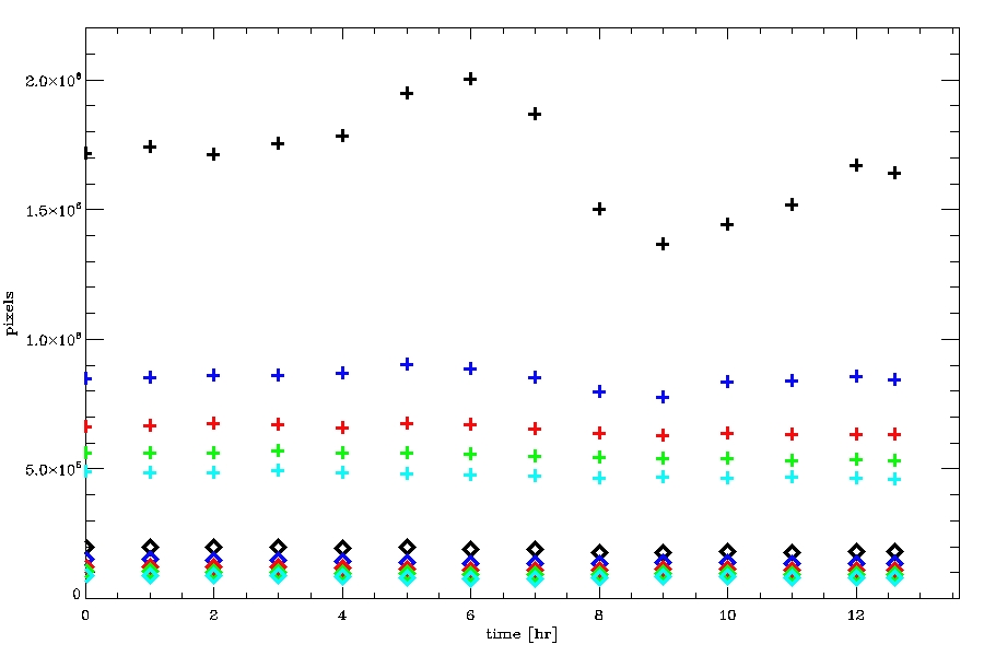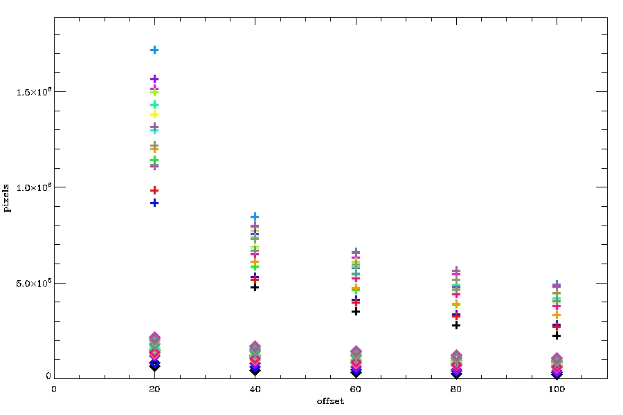 Consider first the variation through half a day (or through roughly the extent of the orbital velocity variations) for 2012.01.01. Black is offset=20, dark blue is offset=40, red is offset=60, light green is offset=80, light blue is offset=100. There are large variations over a few hours in the number of pixels being annealed when offset=20, and the variations decrease in amplitude with increasing values of offset.