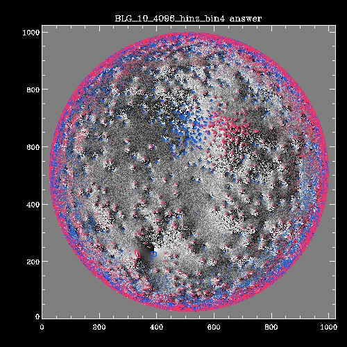 To quanitfy these results, I ran the disambiguation code, including annealing of strong transverse field pixels (unlike above, where no pixels were annealed), for a set of random number seeds, and the various choices for what to do in weak transverse field regions. In addition to the "potential field acute angle" and "most radial" choices, I included a "random" determination. Four ways of quantifying the results are given in the following table, with an uncertainty estimate based on the variations among the random number seeds.