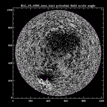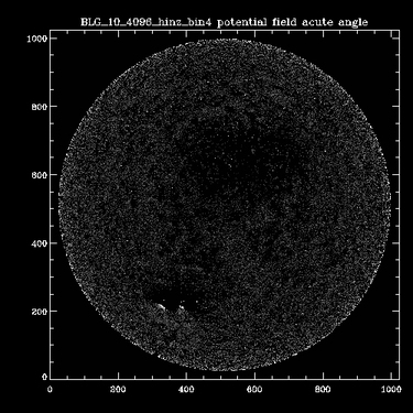 Disambiguate all pixels based on potential field acute angle (top row) or most radial solution (bottom row). Black is correct, white is incorrect.Another way to view the importance of the differences: the greyscale shows the magnitude of the difference in the field between the model field and the results of the disambiguation, saturated at 300G.