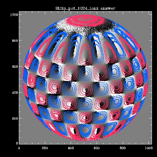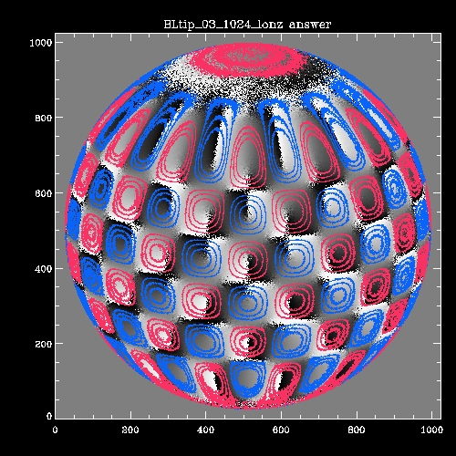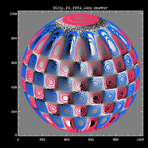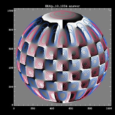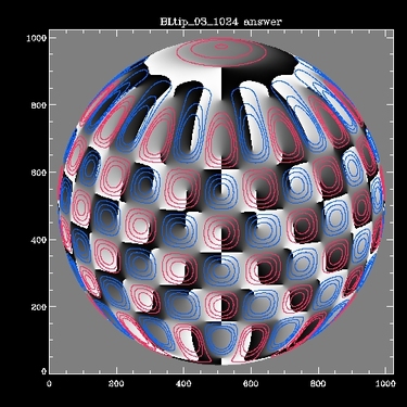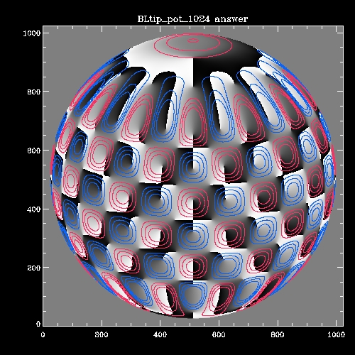 This model has purely horizontal currents, which change the magnitude, but not the direction of the horizontal field at the surface. Thus, if one can construct the potential field whose radial component matches on the boundary, a potential field acute angle disambiguation will work very well. This is unlikely to be true for the Sun, so the potential field disambiguiation here is likely to be better than we can expect for real data.
