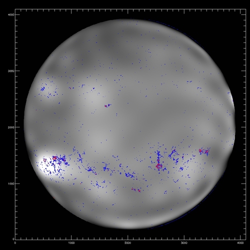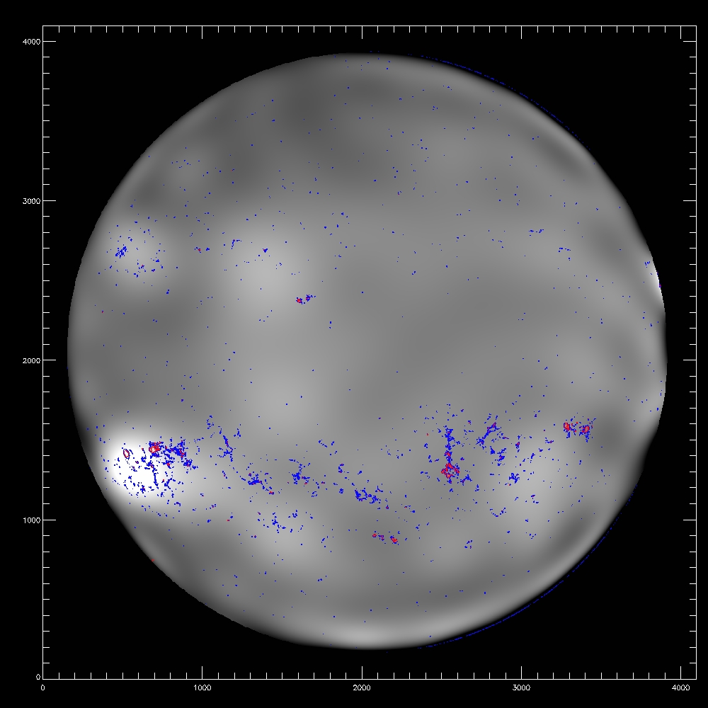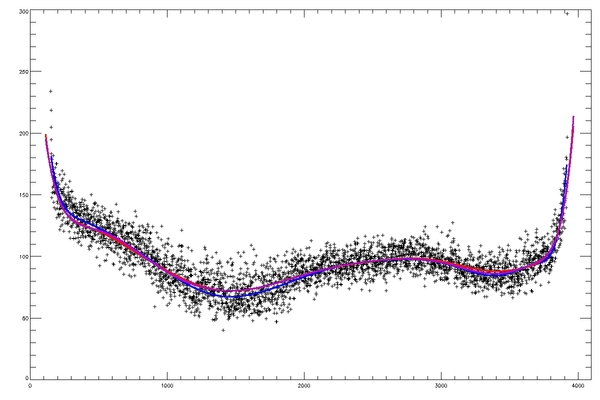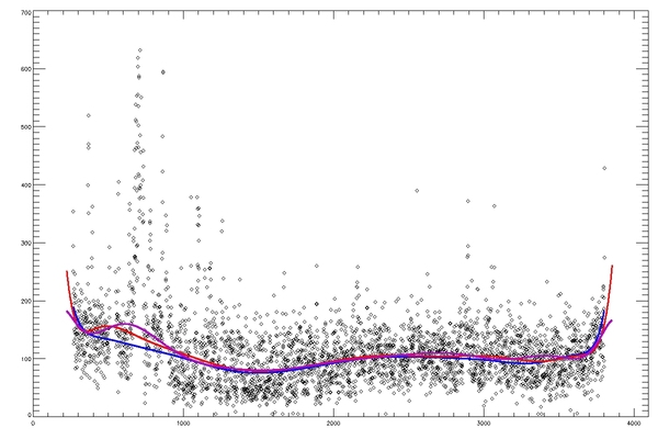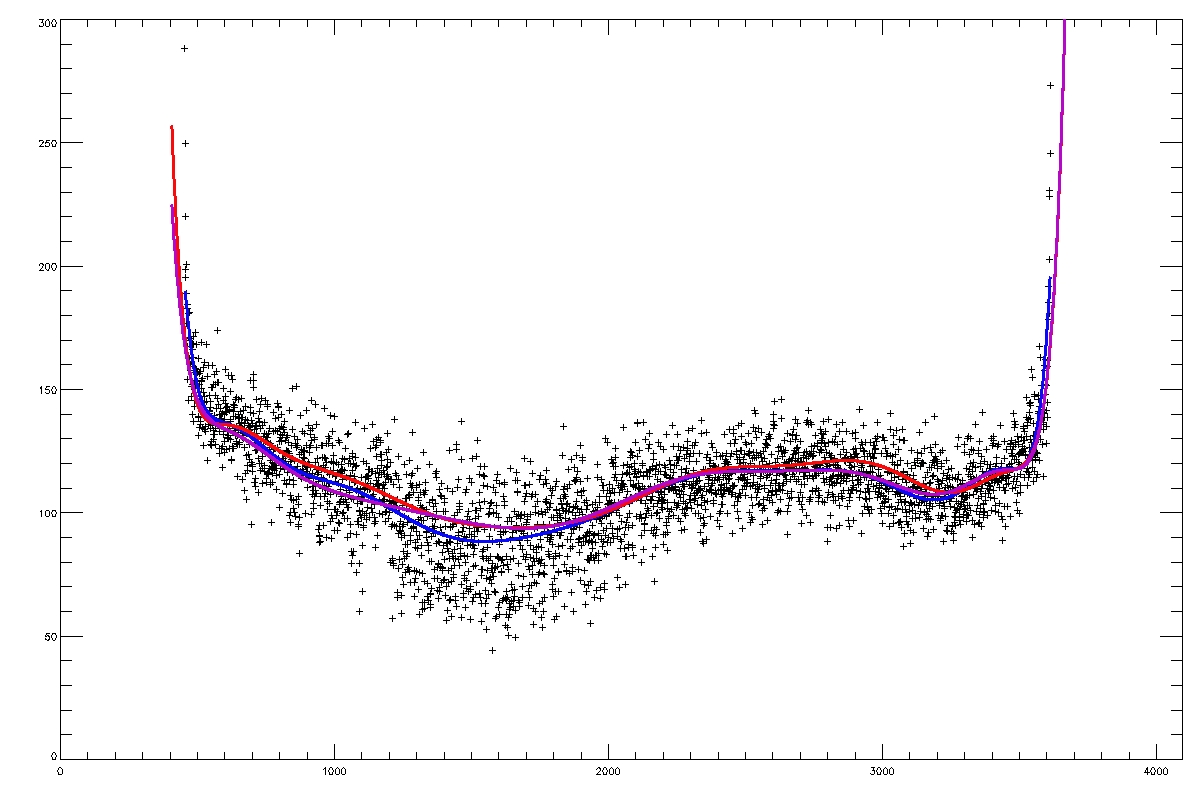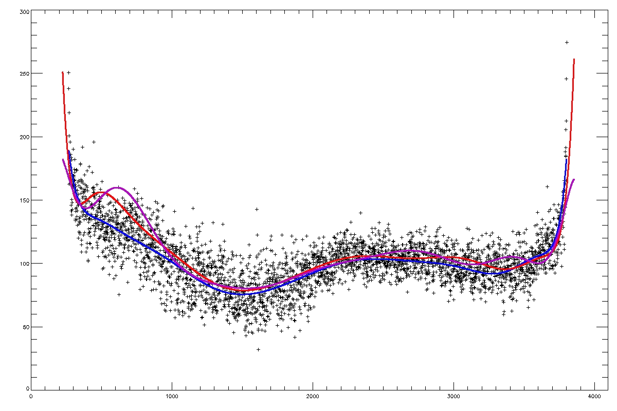 Summary:The following plots compare the 15th order fit to the median (blue) to the 15th order fit to the field itself, excluding active regions patches (red) and excluding active region "blobs" (purple), overlaid on the median (first three images) or the field itself (fourth image). The first four plots are slices at y=1024, y=1400 y=2048 and y=1400; the last image is the difference between the fits, scaled to +/-20, overlaid with contours of the field at 500,1000.