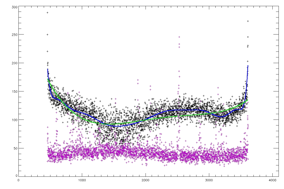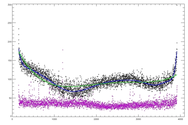 Slice across the disk at y=1024 (top) and y=2048 (bottom), showing the median (black), the 15th order fit to the median (blue), the 5th order fit to the median (green) and the rms (purple).