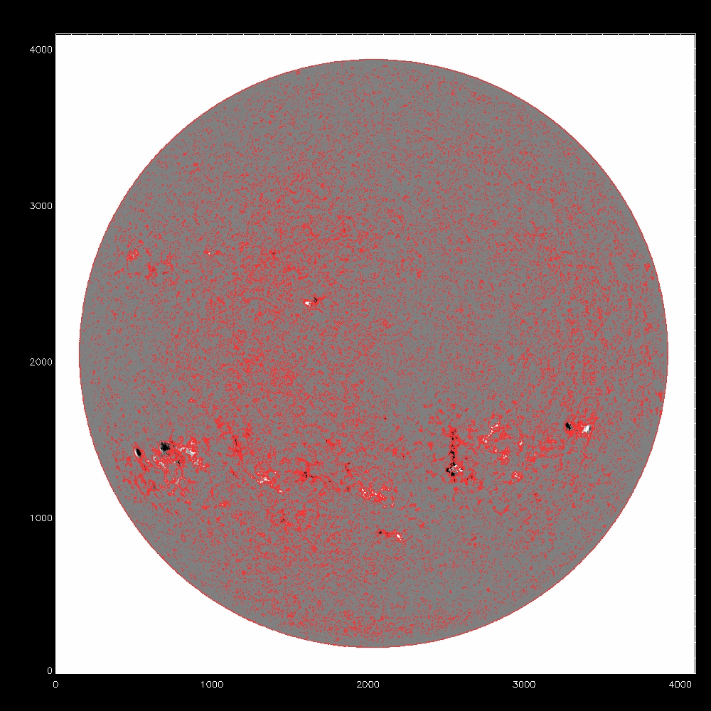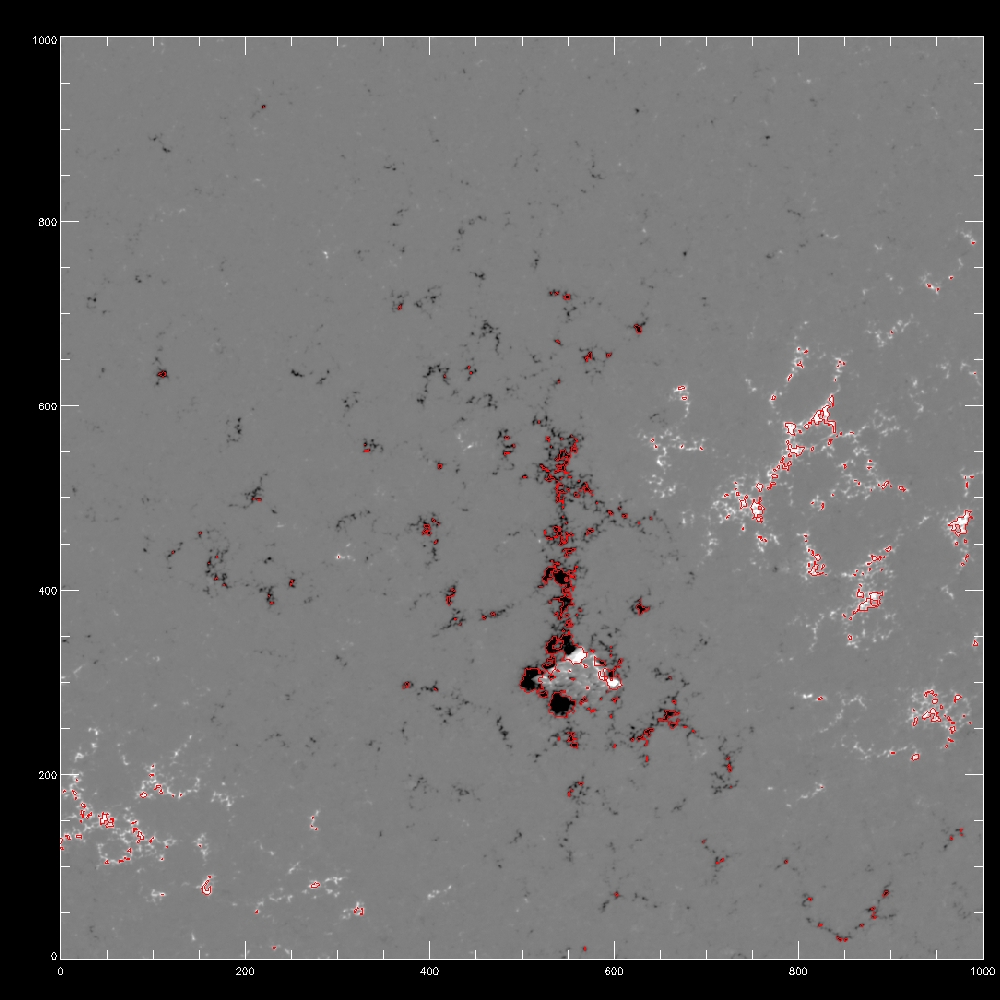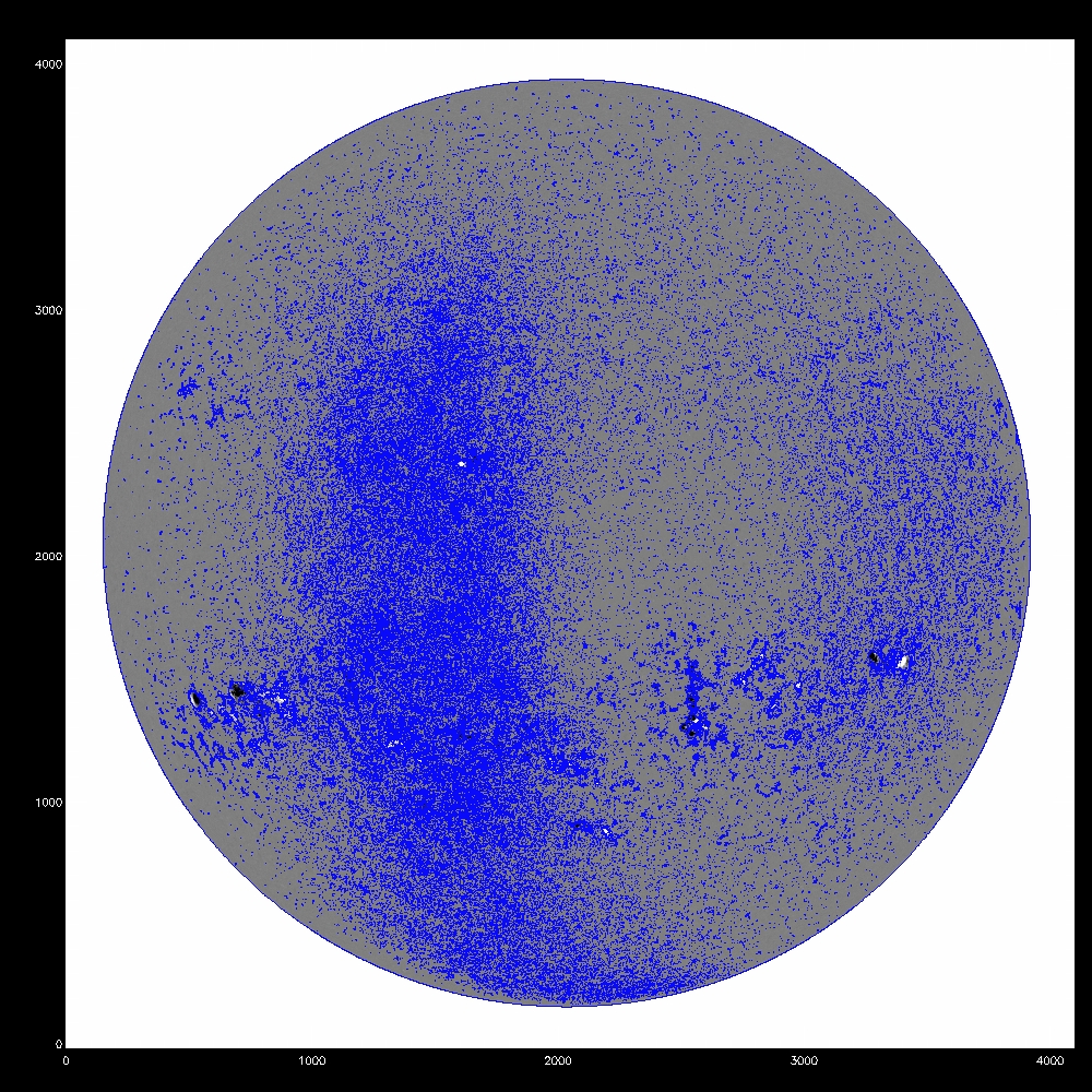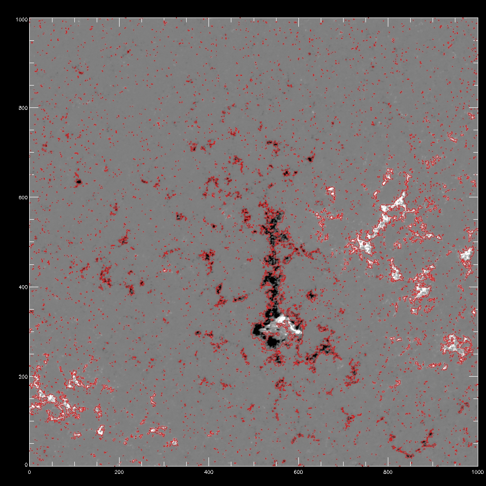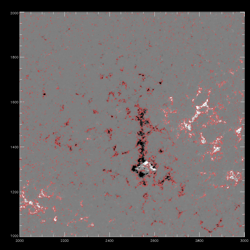 Now consider using the median, the fit to the median and the rms to determine a threshold for the disambiguation module. All the images which follow show the line of sight component of the field, saturated at +/-500G. Contours indicate possible mask arrays defining which pixels to disambiguate using simulated annealing. The left column shows blue contours of the chosen threshold itself, while the middle and right columns show red contours of the mask array after eroding by 1 pixel, which eliminates isolated pixels in the mask. The annealing algorithm cannot properly treat isolated pixels, as it uses finite difference to calculate derivatives. The right column is the subarea from pixels 2000:3000 and 1000:2000.