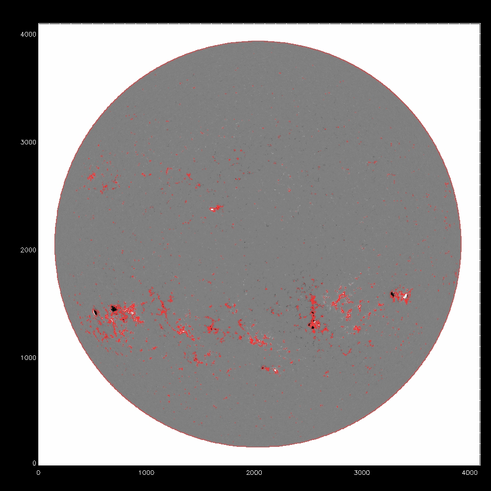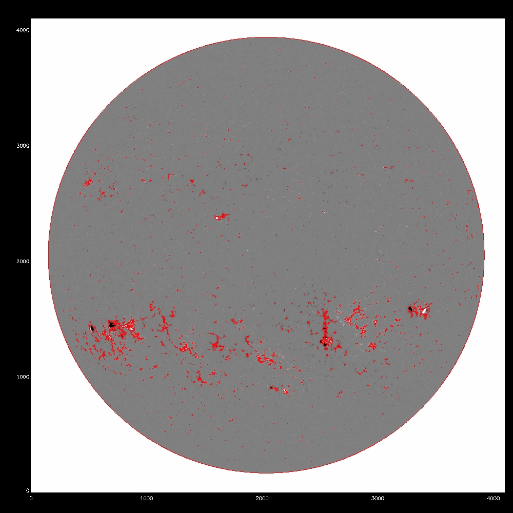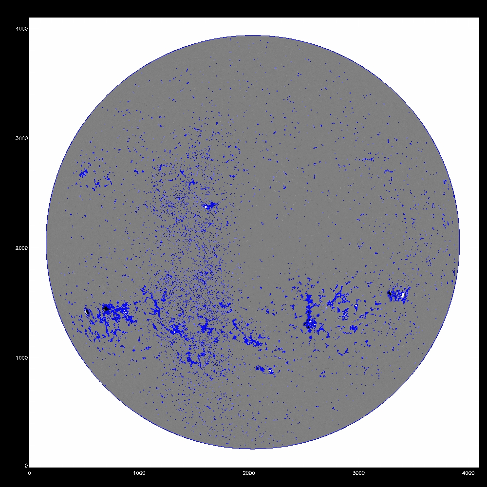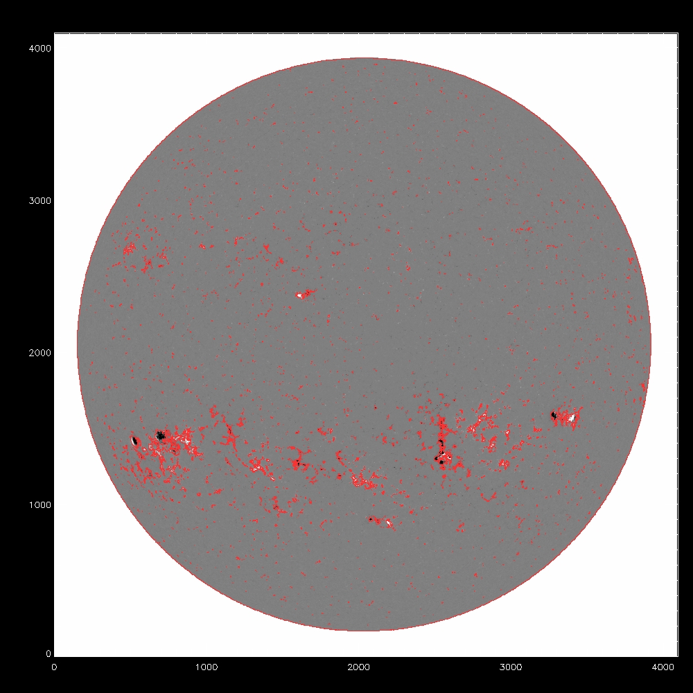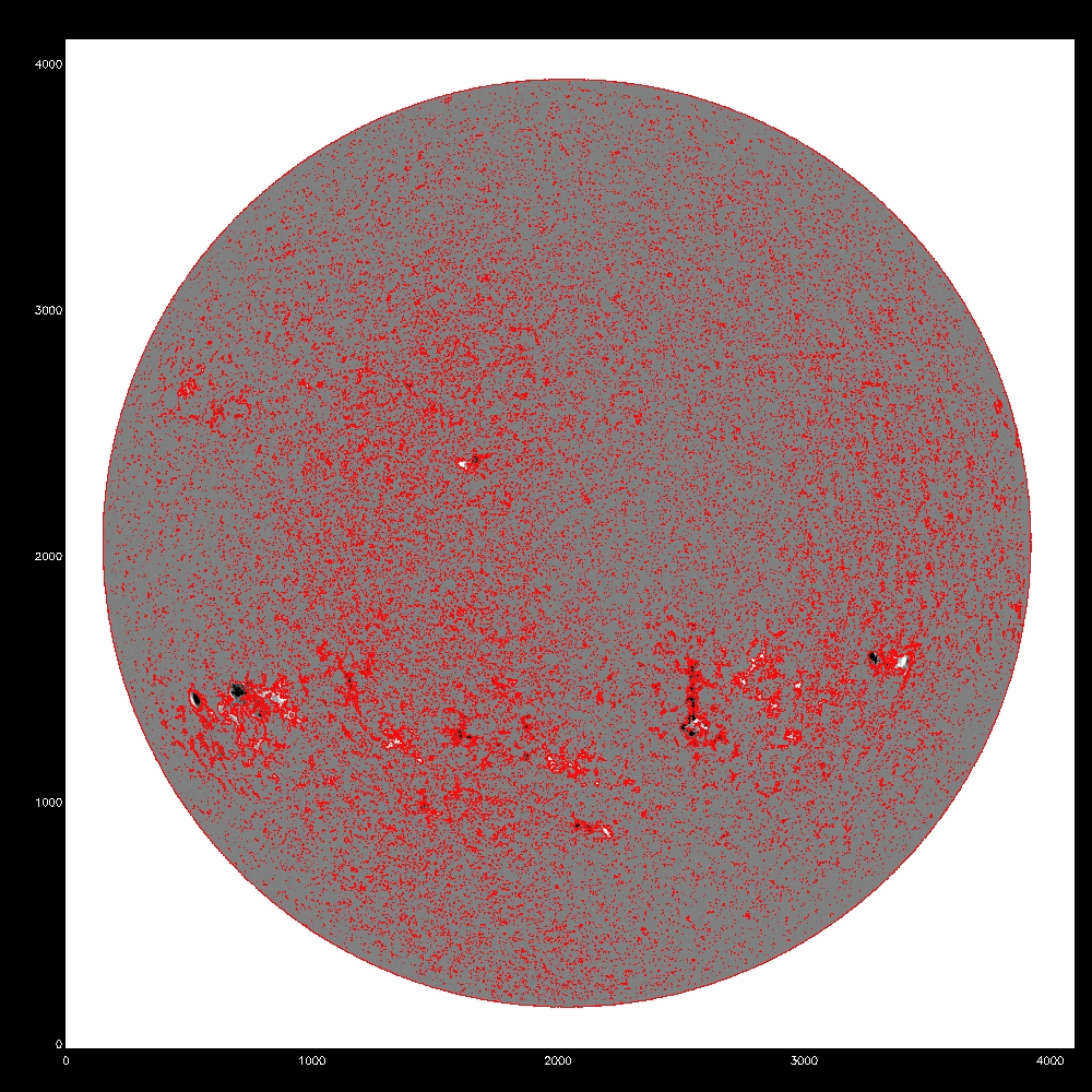 Now consider using the median, the fit to the median and the rms to determine a threshold for the disambiguation module. All the images which follow show the line of sight component of the field, saturated at +/-500G. Contours indicate possible mask arrays defining which pixels to disambiguate using simulated annealing. The left column shows blue contours of the chosen threshold itself, while the middle and right columns show red contours of the mask array after eroding by 1 pixel, which eliminates isolated pixels in the mask. The annealing algorithm cannot properly treat isolated pixels, as it uses finite difference to calculate derivatives. The right column is the subarea from pixels 2000:3000 and 1000:2000.