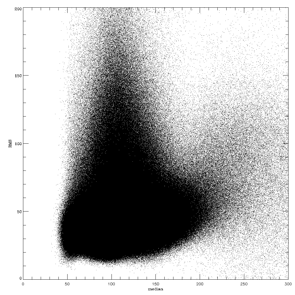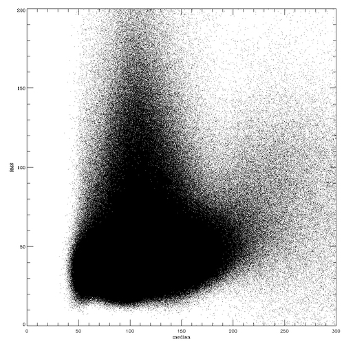 Scatter plot of the median versus the rms. The correlation coefficient is +0.24. My guess is that this mainly reflect the center to limb variation, where both typically increase, at least close to the limb. There is also a tail to large values of the rms for median values around 100, but it does occurs at a relatively constant value of the median.