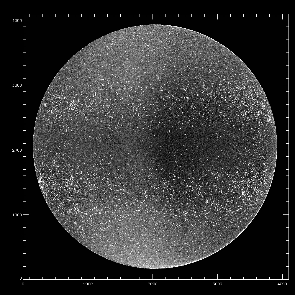 In both the images and the slices, it can be seen that the median is generally smaller immediately to the left of disk center compared to immediately to the right of disk center, while the opposite is true closer to the limb. It can also be seen (note the different scale for the rms image) that the rms is smaller than the median, usually by at least a factor of two, although slightly less close to x=1500. The amplitude of the large scale variations in the rms is also substantially less than the large scale variations in the median.