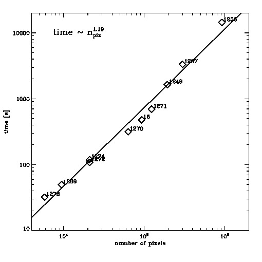 The scaling of the run time with the number of pixels in the HARP is close to a power law with index a little larger than one. The exact index depends on the choice of AMBNEQ and AMBTFCTR. An example for AMBNEQ=100 and AMBTFCTR=0.99 is shown. Clearly, the largest HARPs will dominate the time to disambiguate, and to a first approximation, we can probably consider the run time to simply be proportional to the total number of pixels.