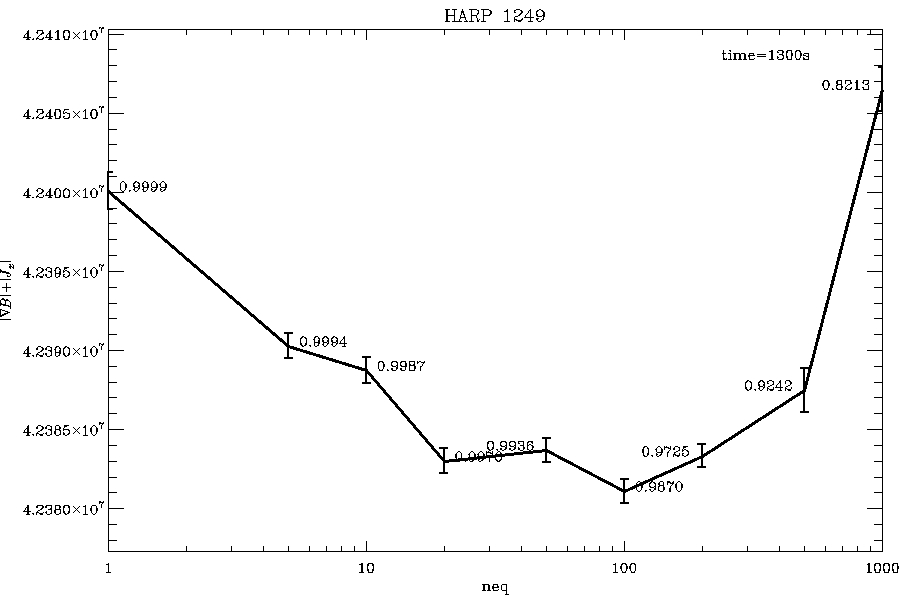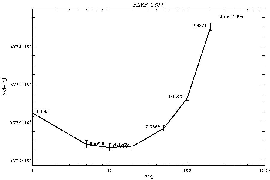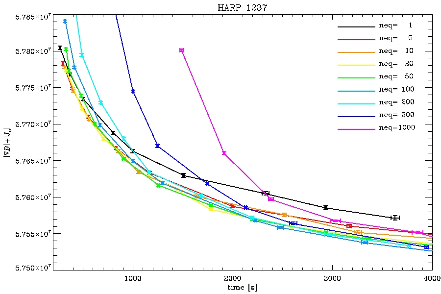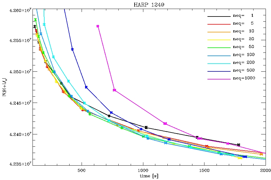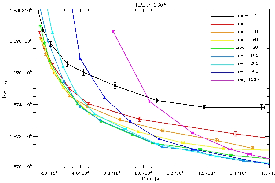 The following plots show for each HARP the final energy (|div B| + |Jz|) from the annealing algorithm as a function of run time for a variety of annealing parameters. Each point is the average over different random number seeds, with an error estimated from the standard deviation. Each color corresponds to a different value of the number of times a pixel is visited at a given temperature (AMBNEQ), while each point of a given color corresponds to a different rate of cooling (AMBTFCTR).