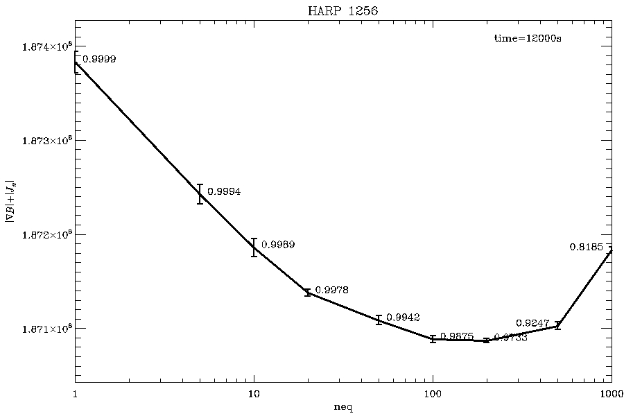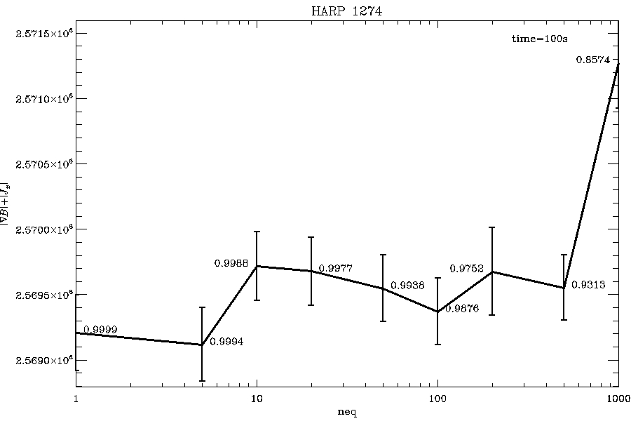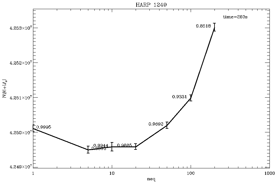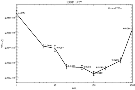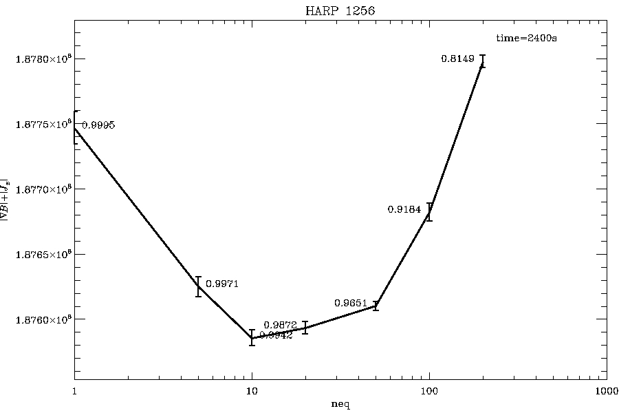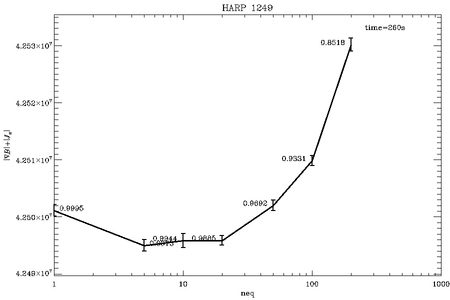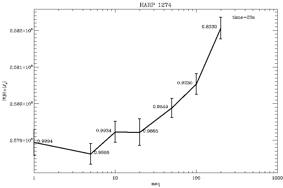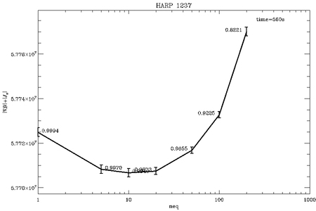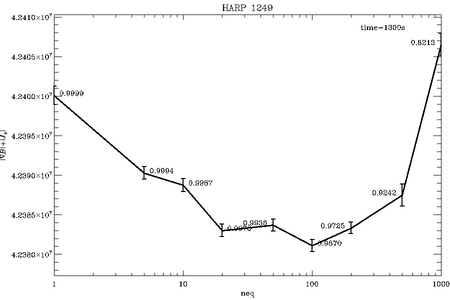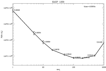 To further illustrate this, I selected two run times for each HARP and interpolated the final energy for each value of AMBNEQ to those run times. Each point is also labeled with an interpolated value of AMBTFCTR. On the left (first) is a short run time; on the right (second) is a long run time. Typically, the minimum energy occurs for AMBNEQ~10 for the short run time, and AMBNEQ~100 for the long run time. The results for the smallest HARP (1274) are less clear, with large (fractional) uncertainties. Note, however, that the final energy for this HARP is at least an order of magnitude smaller than in any of the other HARPs.