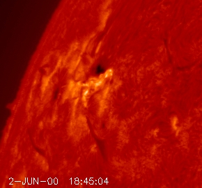 Solar flares are sudden rapid releases of energy. They occur when the magnetic fields on the Sun rearrange themselves into a state of lower energy giving up the tremendous amount of extra energy they had before rearrangement in the form of electromagnetic radiation and streams of high energy atomic particles. They are the most energetic explosions in our solar system. The amount of energy released can be huge, about the same as would be released by a 10 million volcanic explosions on Earth, and it is all released in just a few minutes. Huge flares occur only a few times during the solar cycle maximum, but many smaller flares occur much more frequently.